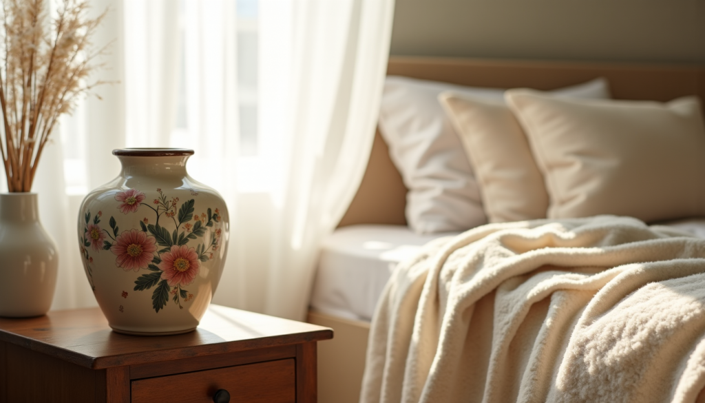 L’art de l’intégration réside aussi dans le mélange des styles. Un vase vintage des années 60 aux motifs géométriques peut dialoguer avec un mobilier plus contemporain, créant un contraste intéressant qui dynamise l’ensemble sans le rendre froid. Un vase en poterie des années 70 s’accordera parfaitement avec des textiles en lin, des plaids en maille et des coussins moelleux, renforçant l’esprit bohème et naturel de la chambre. L’idée est de créer une composition qui raconte une histoire, la vôtre, en associant des objets qui vous parlent.